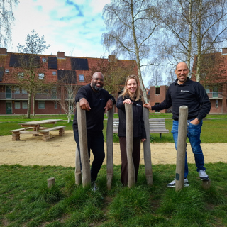 Dit zijn Farley, Ilse en Abdel. Als buurtteam van de Kersenboogerd zijn zij dagelijks in de wijk te vinden. ‘Wij werken heel praktisch’, vertelt Ilse. ‘We spreken bewoners aan als dat nodig is. Als er een probleem is, zoeken we samen naar een oplossing. En als het lukt, betrekken we buurtgenoten hierbij. Samenleven doen we met elkaar!’