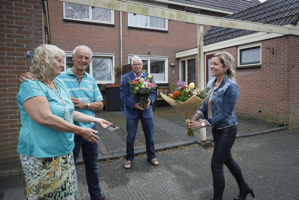 Alle 65 jubileumhuurders in regio Hoorn, Purmerend en Waterland kregen van Intermaris een mooie bos bloemen thuisgestuurd. Op meneer Smit en mevrouw Overman uit Monnickendam na. Omdat zij vanaf 1 maart 1980 ook nog eens buren zijn, kregen zij de bloemen persoonlijk aangereikt. Of beter gezegd: aangegooid. We namen natuurlijk wel de coronamaatregelen in acht.