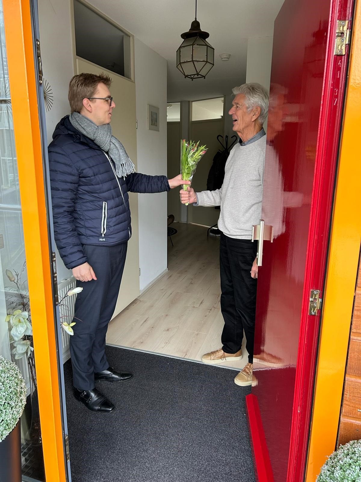 Het weer liet wat te wensen over, maar dat mocht de pret niet drukken. Vol enthousiasme gingen de medewerkers op pad om bewoners te verrassen met een compliment en een bosje tulpen. “Bewoners die iets betekenen voor onze wijken en andere bewoners zijn heel waardevol. We zetten hen graag in het zonnetje”, vertelt Jurre Terhorst, directeur Wonen. Samen met Community Coach Robin Oud gaat hij op pad om bewoners te verrassen.