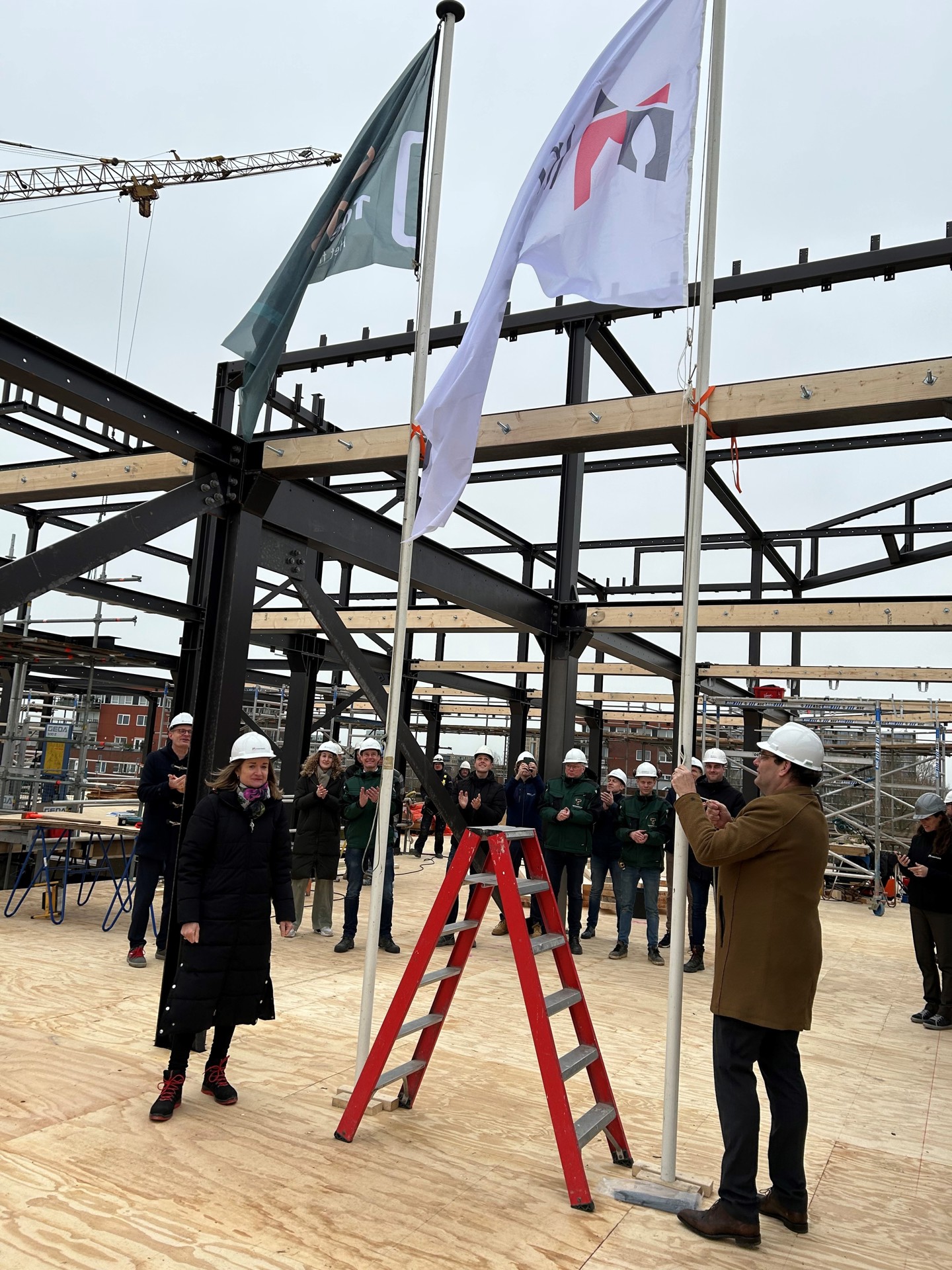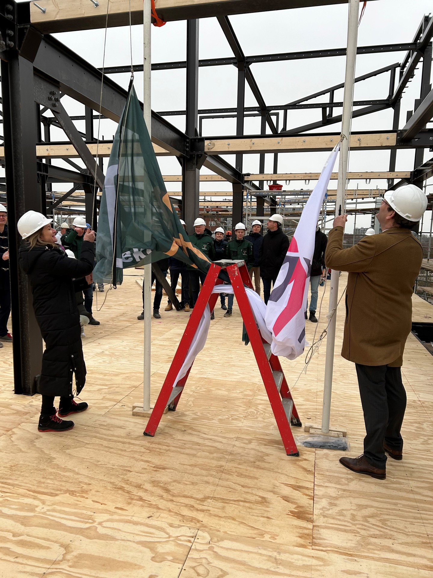 Op donderdag 8 februari bereikte de nieuwbouw aan de Gorslaan in Purmerend het hoogste punt. Intermaris bouwt het voormalige kantoorpand om tot 57 woningen voor jongeren van 23 tot en met 27 jaar. Het hoogste punt werd gevierd met aannemer De ToekomstGroep uit Andijk, ontwerpende architect en constructeur EWP uit Purmerend, Tekenbureau Breg & Breg uit Enkhuizen en Intermaris. Na enkele mooie woorden over de goede onderlinge samenwerking werden de vlaggen in top gehesen door Iphigenia Westphal, directeur Vastgoed bij Intermaris en Jan Piet Konijn, directeur van De ToekomstGroep.