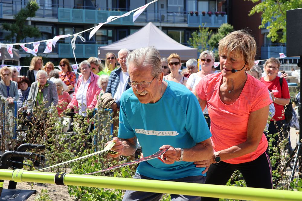 Olga Commandeur, bekend van het tv-programma Nederland in Beweging, gaf na de warming-up een demonstratie per toestel met de senioren van Hoorn beweegt. Ook de kinderen die aanwezig waren, deden volop mee. Olga: “Je kunt de oefeningen individueel doen, maar ook samen. Of je gaat met kinderen en kleinkinderen de beweegtuin in. Om vaardigheden te behouden of terug te krijgen die je helpen in het dagelijks leven.”