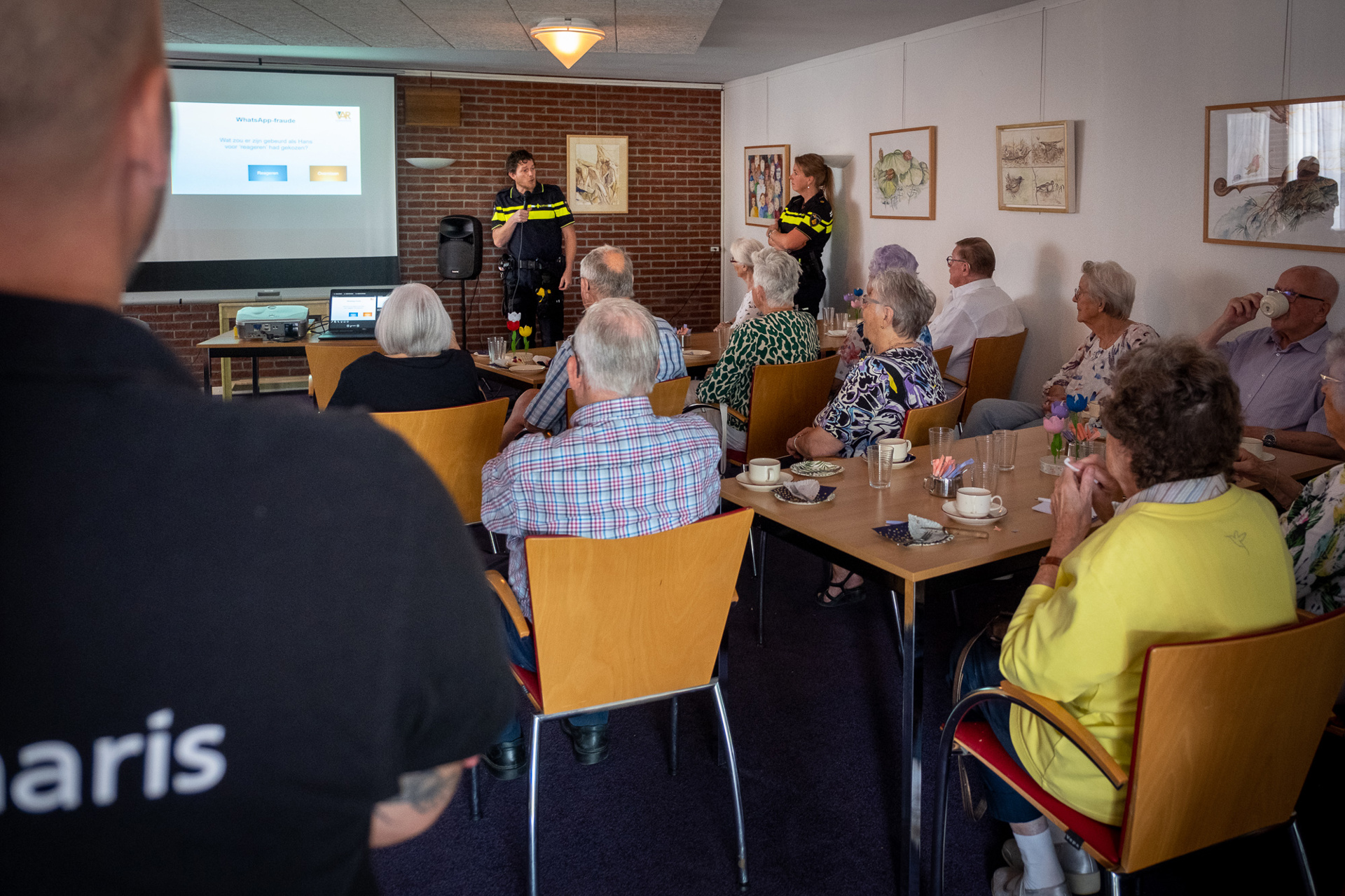 Een dame is de zaal wijst de rechercheur erop dat oplichters ook ouderwets aanbellen om binnen te komen. Hoe reageer je dan? “Op dezelfde manier”, antwoordt Rick, “Niet binnenlaten. Of niet eens opendoen. Geen enkele serieuze instantie komt bij u langs, zeker niet zonder afspraak.” Zo beantwoordt de politie alle vragen. Dan steekt een bewoner zijn hand op. “Ik ben twee jaar geleden opgelicht via WhatsApp. Wat schaamde ik mij! Oh, wat voelde ik me dom... En toch vertel ik het. Het leek namelijk zó echt. Dat gun ik niemand.”
