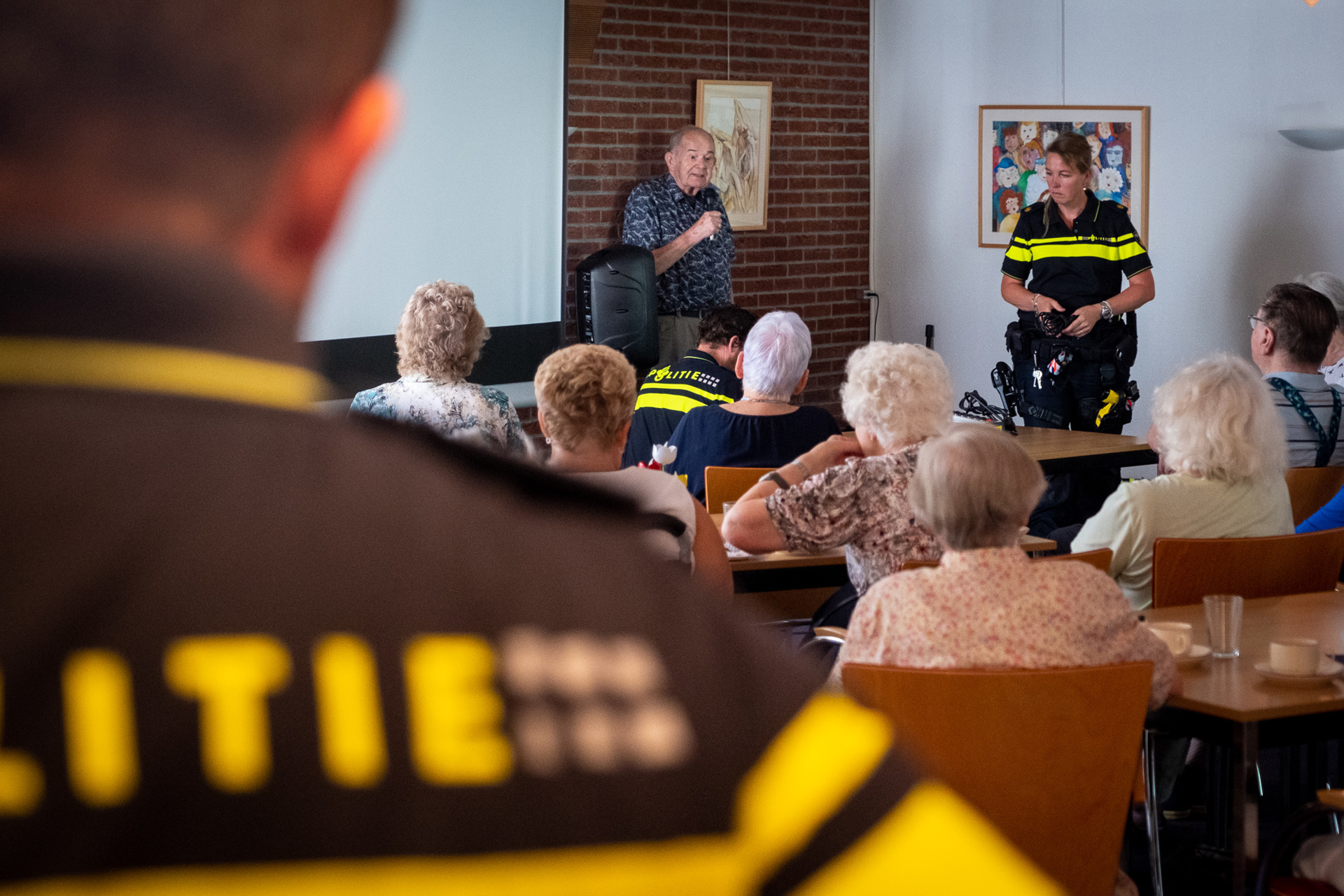 Wijkagente Miranda geeft de man een groot compliment: “Dit is precies onze laatste tip: praat erover als het u is overkomen. Daar kunnen andere mensen en de politie van leren.” De presentatie zit erop. Hoog tijd voor nog een kop koffie. Genoeg stof tot napraten. Het was leerzaam!