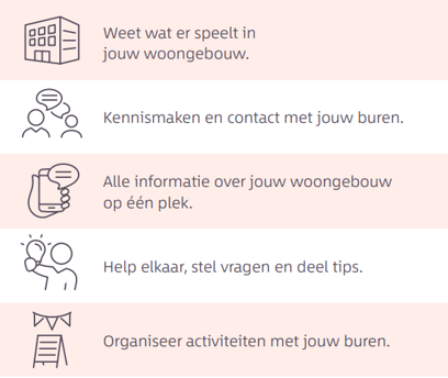 Alleen bewoners krijgen toegang tot de app. Het helpt om makkelijk contact te maken met uw buren. Zo weten jullie elkaar snel en gemakkelijk te vinden. En alle bewoners kunnen activiteiten organiseren in de kalender. Wij vinden het belangrijk dat bewoners goed contact hebben met elkaar. Met de app kunnen we de leefbaarheid en prettig wonen nog beter maken. Door elkaar te helpen, maken we de buurt en het woongebouw nog mooier.
