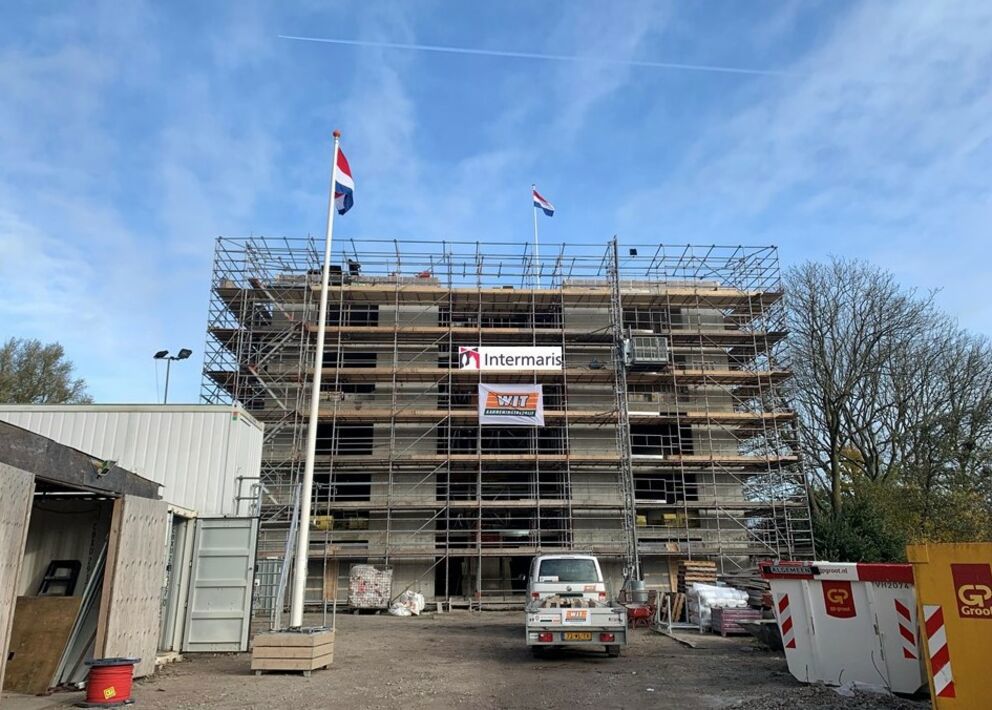 Aan de Purmerweg in Purmerend bouwt Intermaris 35 nieuwe appartementen. Het complex heet De Wherelanden. Op donderdag 18 november bereikte de bouw het hoogste punt. Normaal gesproken is dat reden voor een feestje. Maar vanwege de huidige corona-uitbraak heeft aannemingsbedrijf Wit Wognum zelf de vlag gehesen om het hoogste punt te markeren.