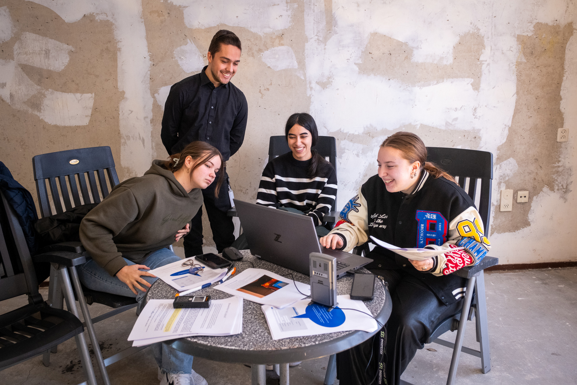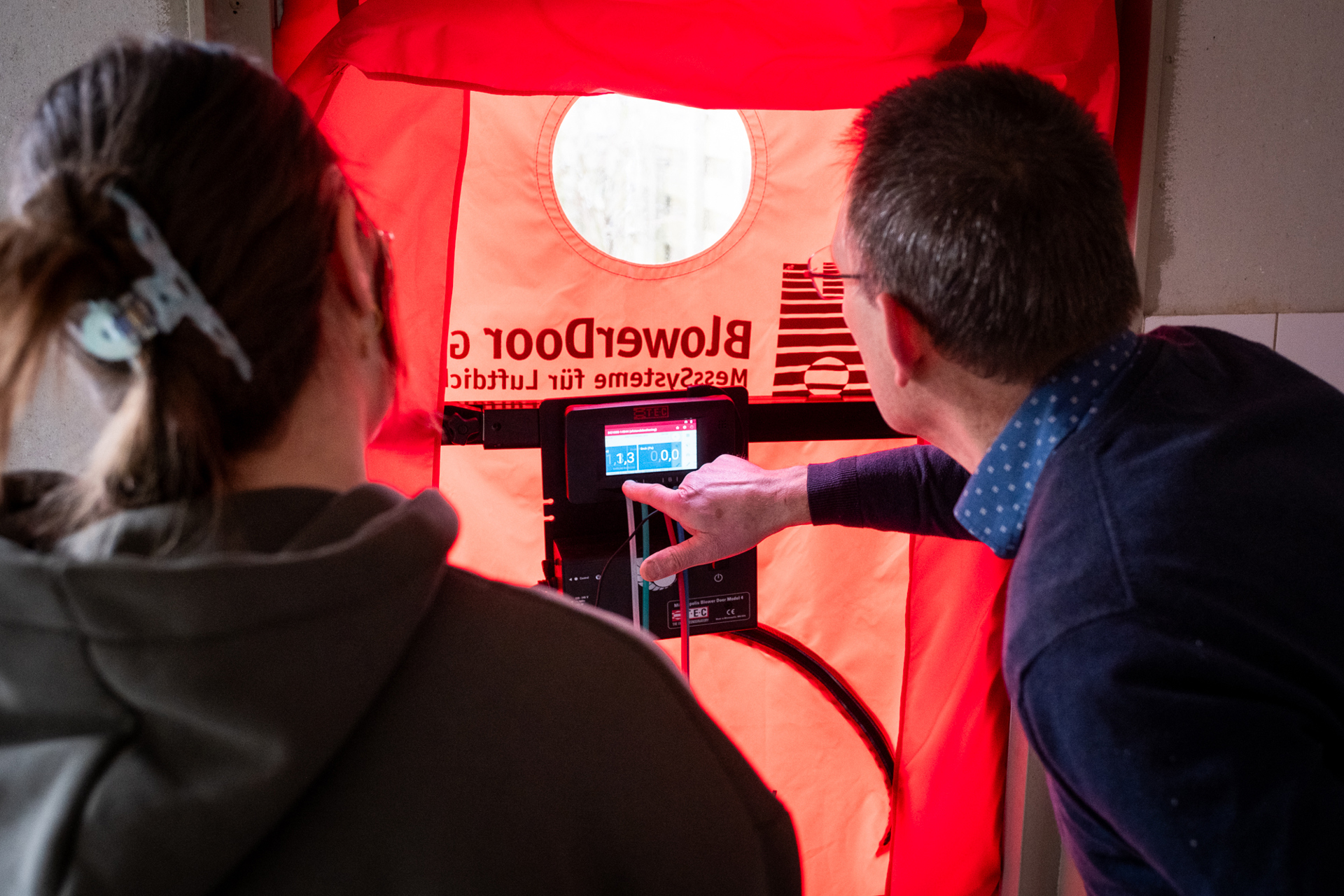 De studenten zijn tweedejaars mbo’ers. Zij volgen verschillende bouw-gerelateerde opleidingen. Romy (18) legt haarfijn uit wat een blowerdoortest is: “Hiermee stel je vast hoeveel lucht er ontsnapt of binnenkomt via kieren of andere ongewenste openingen. Daarna brengen we deze plekken in beeld met een thermocamera. Op basis hiervan adviseren we maatregelen om het binnenklimaat en de energiezuinigheid te verbeteren.”